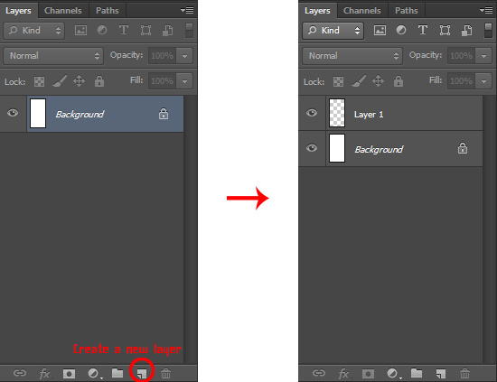 새 문서를 생성한 후, 레이어를 추가로 하나 더 생성한 모습의 레이어 팔레트 입니다. 새로운 레이어를 생성은 레이어 팔레트 하단의 오른쪽 두번째 아이콘인 Create a new layer를 클릭하면 됩니다. 새로이 생성된 레이어는 기본적으로 최상단에 배치됩니다.