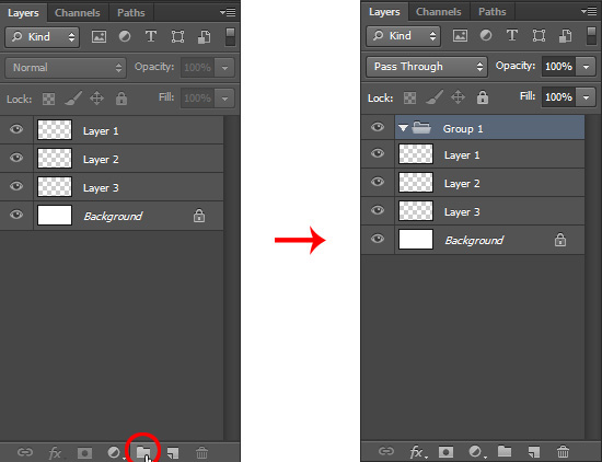 포토샵의 레이어는 폴더 형식의 그룹을 만들 수 있습니다. 하단 오른쪽 3번째 아이콘인 Create a new group을 클릭하여 새 그룹을 생성합니다.