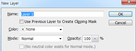 Ctrl + Shift + N 키로도 새로운 레이어를 생성할 수 있습니다. 이렇게 하면 생성 할때부터 레이어의 이름과 컬러, 블렌딩 모드, 오패시티를 미리 지정하여 생성할 수 있습니다. (레이어 팔레트에서 Alt키를 누른채로 Create a new layer 아이콘을 눌러도 같은 창이 나타납니다.)