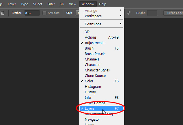 레이어 팔레트가 보이지 않는다면 Window 메뉴 > Layers 항목(F7)이 체크되어있는지 확인하세요. 만약 저 항목이 체크해제되어 있다면 눈을 씻고 찾아봐도 못찾을거에요. ^^