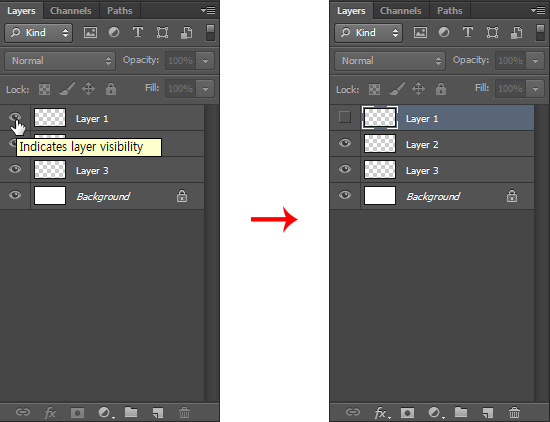 작업을 해야할 레이어가 위 레이어에 가려 작업에 방해가 된다면 위 그림처럼 눈동자 모양의 아이콘인 Indicates layer visibility를 클릭하여 잠시 레이어를 숨겨둘 수 있습니다. 숨겨둔 레이어는 마치 없는 레이어 처럼 화면상에 나타나지만, 다시 눈동자 아이콘을 클릭하면 본래의 모습으로 되돌아 옵니다. (여러개의 레이어의 눈동자 아이콘을 클릭하고 아래로 드래그 하면, 지나간 자리의 눈동자 아이콘이 모두 클릭한 효과가 됩니다.) (그리고 Alt 키를 누르고 눈동자 아이콘을 클릭하면, 해당 레이어를 제외한 나머지 모든 레이어의 눈동자 아이콘이 사라지게 됩니다. 다시 Alt 키를 누른채로 그 눈동자 아이콘을 클릭하면 원래대로 되돌아 갑니다.)