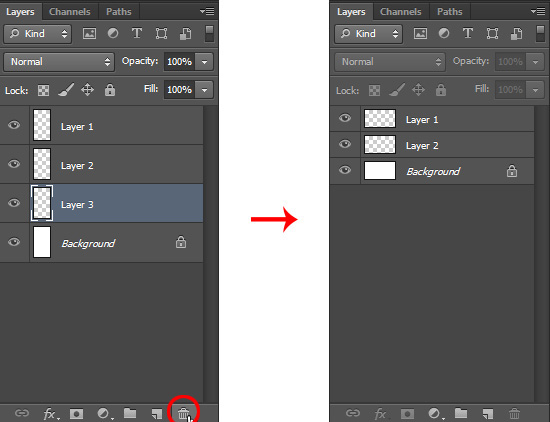 삭제하고싶은 레이어를 선택한 후 Delete layer 아이콘을 클릭하여 해당 레이어를 삭제할 수 있습니다. 아니면 레이어를 Delete layer 아이콘으로 드래그 하여도 삭제할 수 있지요. 삭제할 레이어를 선택 후 백스페이스 키나 Delete 키를 눌러도 됩니다.
