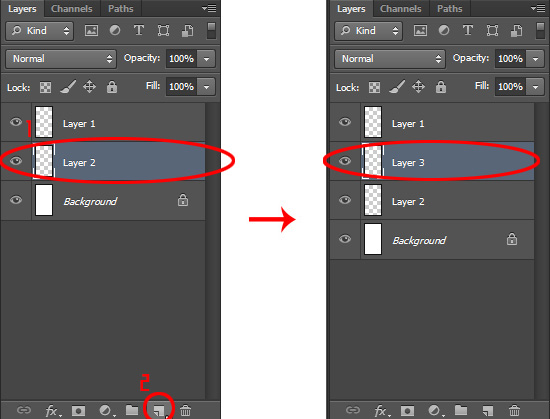 만약 위 그림처럼 레이어2를 선택한 후 새 레이어 생성 아이콘을 클릭하면 방금 선택했던 레이어2 위에 레이어3이 새로이 생성됩니다. 특정 레이어를 선택하지 않고 새 레이어를 만들었을 때는 가장 윗순위에 새 레이어가 생성되는 것과 특정 레이어를 선택하고 새 레이어를 만들었을 때는 선택된 레이어 바로 위에 새 레이어가 생긴다는것이지요. 만약 선택된 레이어 아래에 새 레이어를 생성시키고 싶을 때는 Ctrl을 누른채로 새 레이어 아이콘을 클릭 하면 됩니다.