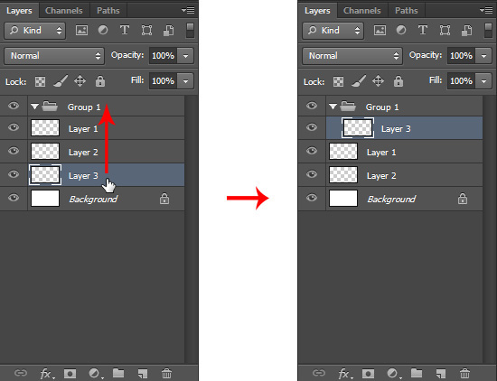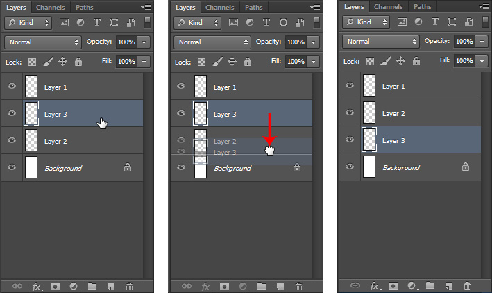 기본적으로 위 레이어가 아래 레이어를 가리거나 영향을 주기 때문에 레이어의 배열 순서가 굉장히 중요하겠지요? 레이어의 순서를 배열하는 방법은 조작할 레이어를 드래그 하여 원하는 위치로 이동하는 것입니다. Ctrl, Shift키를 이용해 여러개의 레이어를 선택한 후 복수의 레이어를 이동시켜도 됩니다. 참고로 Ctrl + [ 과 Ctrl + ] 키를 통해 선택 레이어를 한단계씩 순서를 배열시킬 수 있으며 Ctrl + Shift + [ 과 Ctrl + Shift + ] 키를 통해 선택 레이어를 제일 아래/위로 배열시킬 수 있습니다.
