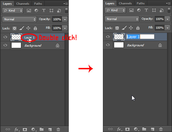 작업을 하다가 이게 무슨 레이어인지 조그만 썸네일 만으로 판단하기에 헷갈릴 경우가 발생합니다. 레이어를 찾기위해 눈동자 아이콘을 하나하나 눌러보는 자신을 발견하기도 하지요. 많은 레이어를 포함한 이미지를 작업할 때는 레이어의 이름을 지어주는것이 좋습니다. 위 그림처럼 레이어의 이름 영역을 더블클릭 하면 레이어의 이름을 지정할 수 있습니다.